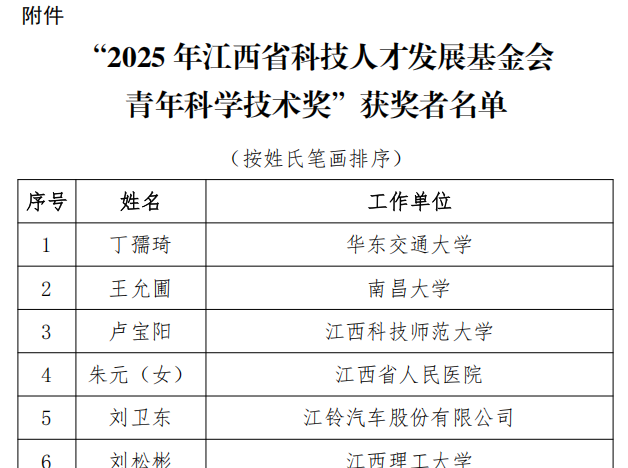 据悉,“江西省科技人才发展基金会青年科学技术奖”(原江西青年科技奖)由江西省科技人才发展基金会于2021年设立,每两年评选一次,旨在表彰在科技创新、科学普及、科技成果转化和经济社会发展中作出突出贡献的青年科技工作者,进一步加强我省高层次创新型人才队伍建设,激励广大青年科技人才勇攀科学高峰、服务高质量发展。